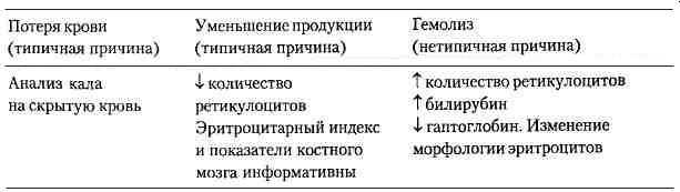 Источник: Bunn H.F.: НРШ-13, р. 314. Анемия, вызванная избыточный разрушением или потерей эритроцитов Кровопотеря: травма, кровотечение из ЖКТ (может быть скрытым); менее типичны урогенитальные источники (меноррагия, значительная гематурия), внутреннее — ретроперитонеальное кровотечение в подвздошно-поясничную область (при переломе бедра). Острое кровотечение сочетается с проявлениями гиповолемии, ретикулоцитозом, макроцитозом; хроническое кровотечение связано с дефицитом железа, гипохромией, микроцитозом. Таблица 135-2 Лабораторная диагностика
