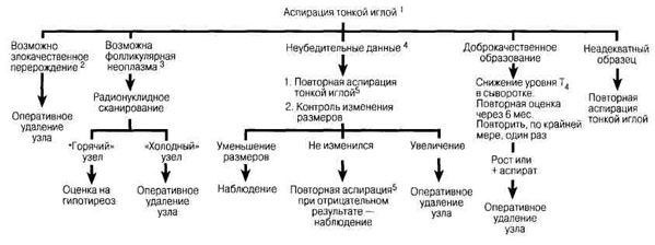 1 — 22-25-й калибр иглы с повторным использованием 18-го калибра, если получена жидкость; 2 — доказанность карциномы (папиллярной, медуллярной, плохо дифференцированной, фолликулярной) или лимфомы; 3 — пласты фолликулярных клеток; 4 — мелкие группы однородных фолликулярных клеток с небольшим количеством коллоида; 5 — характер цитологических изменений требует от клинициста использовать соответствующую ветвь алгоритма. Рис. 148-1. Диагностический