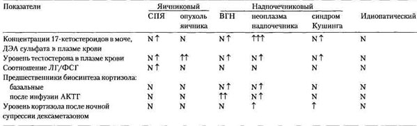 Нормотензивные состояния А. Беременность Б. Терапия диуретинами Гипертензивные состояния А. Первичный ренинизм (ренин-секретирующие опухоли) Б. Вторичный ренинизм 1. Стеноз почечной артерии (атеросклеротический, фибромышечный тип)В. Терапия диуретиками Синдром Бартера Отечные синдромы А. Цирроз печени Б. Нефротический синдром Таблица 149-2 Причины гирсутизма у женщин Семейный Идиопатический Яичниковый А. Поликистозные яичники, гилюсно-клеточная гиперплазия Б. Арренобластома, гилюсно-клеточная Надпочечниковый А. Врожденная гиперплазия надпочечников Б. Приобретенная гиперплазия надпочечников (синдром Кушинга) В. Вирилизирующая карцинома или аденома Источник: Williams L. H., Dluhy R. G.: HPIM-13, р. 1969. Диагноз предполагают у грудных детей, отстающих в развитии, особенно, в сочетании с потерей соли или аномалией половых органов. Лечение — ежедневный прием ггредни-зона 5-7,5 мг, иногда с флюдрокортизоном. Поздняя гиперплазия надпочечников (частичная недостаточность С-21 гидроксилазы) характеризуется высокой концентрацией 17-кетостероидов в моче и ДЭА сульфата в плазме крови. Диагноз предполагают при наличии высокого базального уровня 17-гидроксипрогестерона или повышения уровня 17-гидроксипрогестерона после стимуляции АКТГ (1-4 ч инфузия). Терапия заключается в ежедневном приеме глюкокортикоидов (предни-зон 2,5-5 мг на ночь). Лечение при аденоме и карциноме см. выше. Гирсутизм у женщин чаще имеет идиопатический генез. Дифференциальный диагноз представлен в табл. 149-2, а диагностика — в табл. 149-3. Таблица 149-3 Лабораторная диагностика