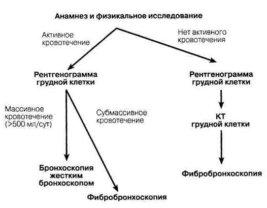 Многим больным показано последовательное проведение КТ грудной клетки, а затем и бронхоскопии. Исследование жестким бронхоскопом особенно ценно при массивном кровотечении или поражении проксимального участка дыхательных путей, когда планируется интубация трахеи; большинству больных показано исследование фибробронхоскопом. Лечение. Основа лечения