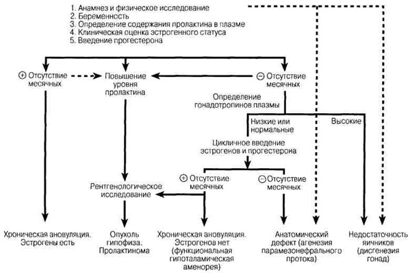 Заболевания яичников и женской половой сферы Нарушения менструального цикла Патологическое маточное кровотечение. При подозрении на маточное кровотечение необходимо исключить его другие источники — прямую кишку, мочевой пузырь, шейку матки и влагалище. В предменструальный период патологическое маточное кровотечение может быть результатом травмы, инфекции или ранний пу-бертат. Кровотечение из влагалища в период менопаузы часто обусловлено злокачественной опухолью. В отсутствие беременности патологическое маточное кровотечение у женщин репродуктивного возраста может быть связано с овуляторными или ановуляторны-ми циклами. Менструальное кровотечение при овуляторных циклах характеризуется спонтанностью, регулярностью наступления, предсказуемостью по продолжительности и величине кровопотери и, часто, болезненностью. Измененные, но регулярные циклы обусловлены органической обструкцией матки лейкомиомами, аденомиомами, полипами эндометрия или, реже, спайками и рубцами матки. Кровотечение между циклическими овуляторными маточными кровотечениями может быть вызвано повреждением влагалища или эндометрия. Менструальное кровотечение, не совпадающее с овуляцией (дисфункциональное маточное кровотечение), обычно безболезненно, нерегулярно по времени наступления и непредсказуемо как по величине кропотери, так и по ее продолжительности. Преходящее нарушение гипоталамо-гипофизарно-овариального цикла — общая причина недостаточности овуляции в период становления менструального цикла. Персистирующее дисфункциональное маточное кровотечение в репродуктивном возрасте обычно вызвано постоянной эстрогенизацией матки, не прерываемой циклическими выбросами прогестерона, что чаще всего встречается при поли-кистозе яичников. Аменорея у женщин детородного возраста обусловлена беременностью, если не доказано ее отсутствие. Даже когда анамнез и физикальное обследование не выявляют беременности, она должна быть исключена с помощью подходящего скринин-гового теста. Первичную аменорею определяют как отсутствие менархе в возрасте 16 лет независимо от наличия или отсутствия вторичных половых признаков, а вторичную аменорею ~ как отсутствие менструаций в течение 6 мес у женщин с предшествующими регулярными менструациями. Причины первичной и вторичной аменореи частично совпадают, и обычно применяют этиологическую классификацию нарушении (рис. 153-1). Начальная диагностика включает тщательное физикальное обследование, определение уровня пролактина в сыворотке крови и оценку эстрогенного статуса. ![]() Рис. 153-1. Алгоритм диагностики аменореи у женщин. Наиболее типичный диагноз для каждой категории указан в скобках. Пунктирные линии показывают, что в некоторых случаях правильный диагноз может быть установлен на основе анамнеза и физикалъного обследования (Воспроизведеноиз CarrB. R., WilsonJ.D.-.HPIM-13). Анатомические нарушения репродуктивной системы. Дефекты, препятствующие кровотечению из влагалища, включают отсутствие влагалища, заращение девственной плевы, разделение влагалища поперечной перегородкой. Эти дефекты определяют при физикальном обследовании. Когда признаки заболевания сомнительны, диагноз может быть установлен после приема медроксипрогестерока ацетата внутрь в дозе 10-20 мг в день в течение 5 дней или введения 