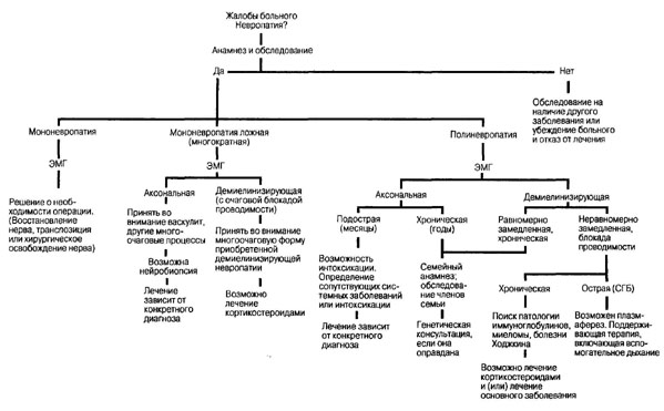 Полиневропатии, связанные с системными заболеваниями Сахарный диабет, уремия, порфирия (три типа), гипогликемия, недостаточность витаминов (В12, фолат, тиамин, пиридоксин, пантотеновая кислота), хронические заболевания печени, первичный билиарный цирроз, первичный системный амило-идоз, гипотиреоз, ХОБЛ, акромегалия, мальабсорбция (спру, глютеночувствительная целиакия), карцинома (сенсорная, сенсорно-моторная, аксональная или демие-линизирующая невропатии), лимфома, polycythemia vera, множественная миелома, доброкачественная моноклональная гаммапатия, макроглобулинемия, криоглобули-немия. Полиневропатии, связанные с лекарственными препаратами и токсинами Амиодарон, ауротиоглюкоза, цисплатин, дапсон, дисульфирам, гидралазин, изо-ниазид, метронидазол, мизонидазол, пергексилен, фенитоин, талидомид, винкрис-тин, акриламид, мышьяк (гербицид, инсектицид), крушина (ядовитая ягода), дисульфид углерода (промышленный), гамма-дикетон гексакарбоны (растворители), неорганический свинец, органические фосфаты, таллий (крысиный яд), пиридоксин (витамин). Генетически обусловленные невропатии Перонеальная мышечная атрофия (HMSN-I, HMSN-II), Дежерина—Сотта (HMSN-III), наследственные амилоидные невропатии, наследственная сенсорная невропатия (HSN-I, HSN-II), невропатия при порфирии, наследственная предрасположенность к параличу от сдавления нерва, болезнь Фабри, адреномиелоневро-патия, болезнь Рефсума, атаксия-телеангиэктазия, абеталипопротеидемия, гигантская аксональная невропатия, метахроматическая лейкодистрофия, шаровидно-клеточная лейкодистрофия, атаксия Фридрейха. Причины мононевропатии Установление причины мононевропатии